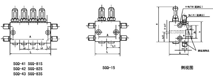 SGQ双线给油器有单向出油和双向出油二种结构形式。单向出油的给油器只有下给油孔,活塞正反排油时都由下给油孔向润滑点供送润滑脂;双向出油的给油器有上、下给油孔,活塞正反向排油时由上下给油孔交替向润滑点供送润滑脂。给油器可以从指示杆的动作直接观察到给油器的工作情况,还可以通过调节螺丝在规定范围内方便地调整各给油口的给油量。