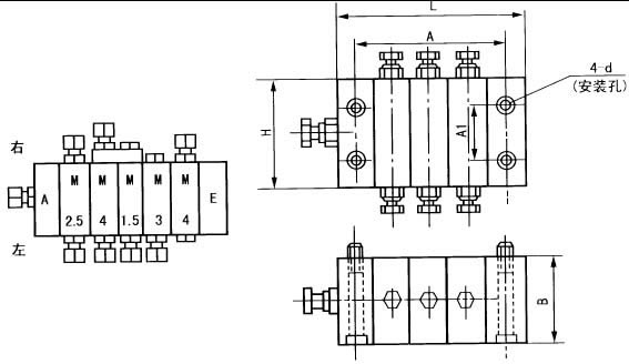 一、概述 JPQ(D)型递进分配器由首块A,工作块M、尾块E 组成分配器组,工作块的件数可根据需要选择,最少三件,最多可达10 件,每件工作块有两个出油口,因此每一分配器组的出油口在6-20 个之间,也就是每一分配器组可供6-20 个润滑点,所需供油量的多少,可按型号规格表列数据选用。如果某润滑点在一次循环供油中需要供油量较大或特大,可采用图A3 的方法,取出工作块内部的封闭螺钉,并在出油口增加一个螺堵,使两个出油口的油量合并到一个出油口。 注意所合并的供油量是工作块排列中下一个工作块型号所规定的供油量(参看工作原理图)。如果合并两个出油口的供油量仍然满足不了需要,可采用图A4 的方法,增加三通或二通桥式接头,以汇集几个出油口的油量来满足需要。
