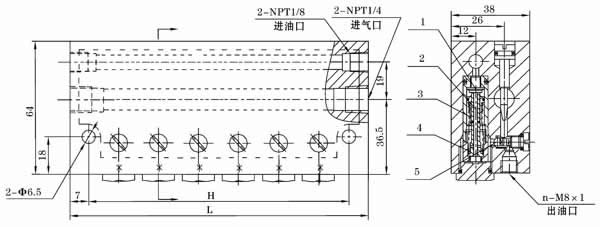 从进油口处进入的压力油,在油压的作用下件1下移,紧贴在件2上端面封住了通油通道,同时打开了进油通道向件3上腔充油,件3在油压作用下克服件4弹簧力向下移动,则件3下腔的油顶开件5进入混合腔,在压缩空气的作用下经混合后的油气从油气出口排出。供油主管卸荷后,件1上部油压低并且件3在件4的作用下向上回位,件3上腔充入的油经已打开的件2上端面流道孔进入件3下腔储存,为下一循环供油作好准备。各口的供气量可通过节流螺丝的开口大小进行调节。